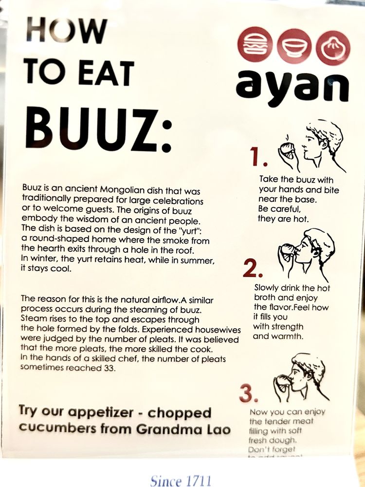 Mongolian dumplings "Buuz" is carefully weighed and folded by hands to achieve our signature Golden Ratio of 33 folds and stuffed with top-quality beef marinated in a blend of carefully-selected seasonings. Paired with the piquant aromas of soy sauce.